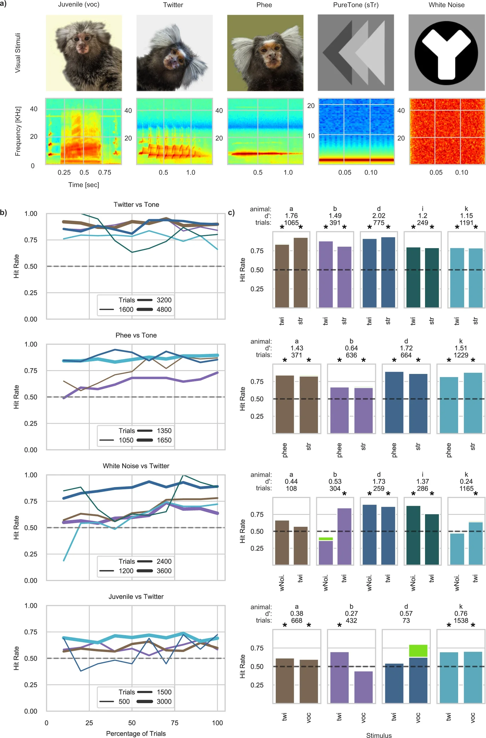 (a) shows the five acoustic categories used: natural marmoset calls (“Juvenile,” “Twitter,” “Phee”) alongside synthetic tones and white noise, each paired with a visual cue and spectrogram.