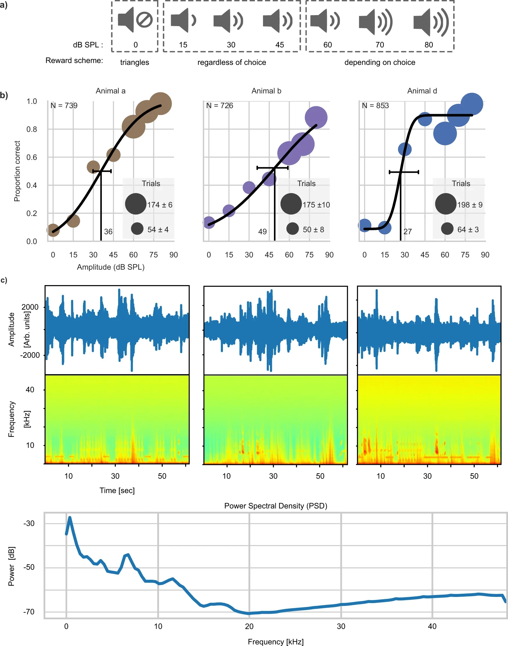 (b) plots the psychometric curves for three animals, showing how accurately they detected the vocalization at each sound level. The vertical lines mark their estimated hearing thresholds (36 dB, 49 dB, and 27 dB SPL respectively), with horizontal bars showing 95 % confidence intervals.